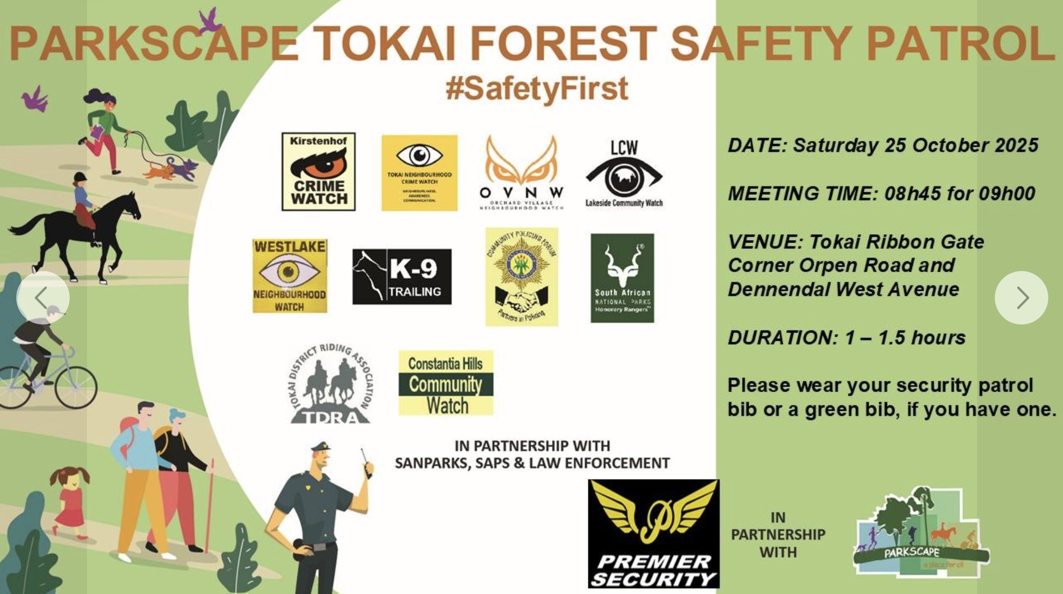 Parkscape supported by Premier Security will be hosting a #visiblesafetypatrol of Lower Tokai and #TokaiForest on Saturday 25 October.